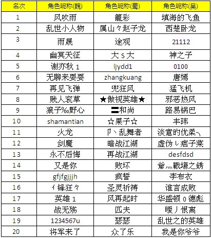 经过激烈的角逐,截止到7月23日11:00魏、蜀、吴三国的威望排名前20名单如下: