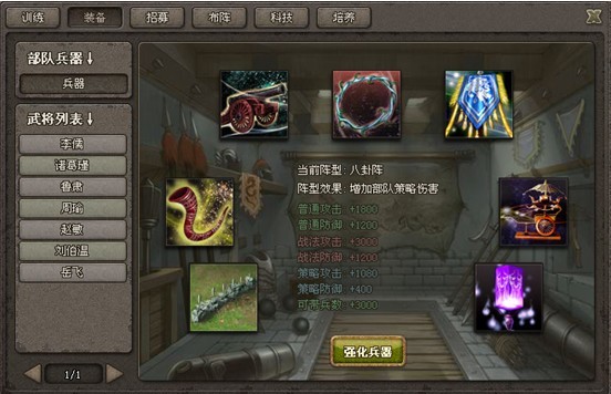 e.装备界面中有一兵器选项。可以通过装备兵器增加当前阵型的各项能力。