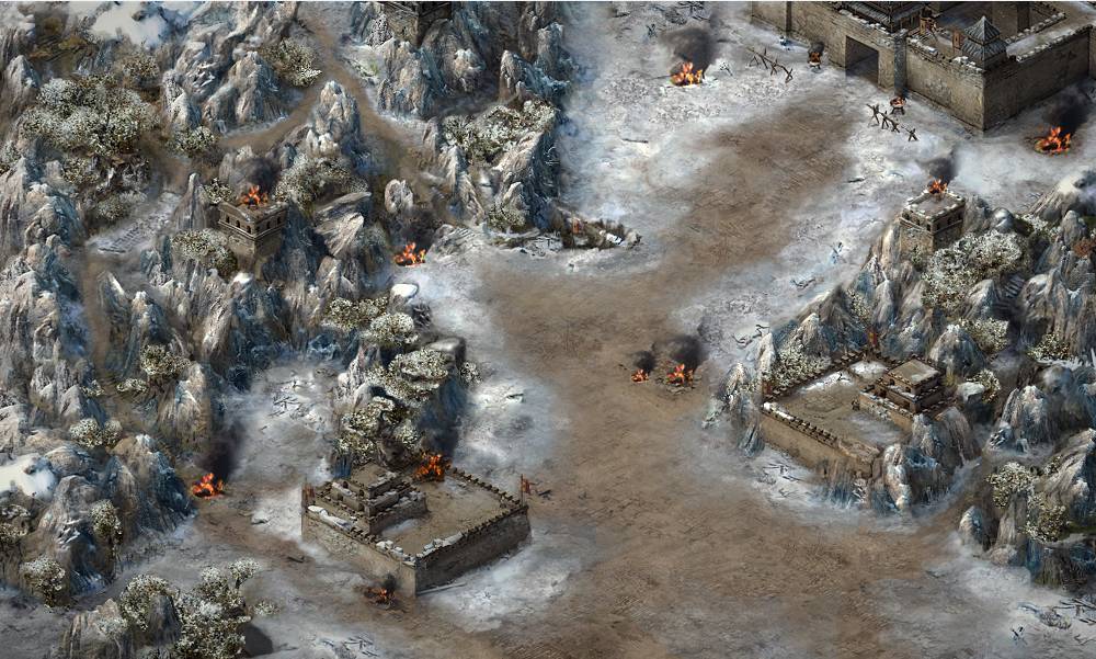 整张西汉副本地图所展现的是一片冰天雪地似北疆的征战场景,星星点点的战火,勾勒出战争的残酷,点缀出厮杀的激烈。在战斗场景的绘制上,依循着与副本相同的主题,沿用冰雪元素将战斗舞台限定在一道“山隘关口”。