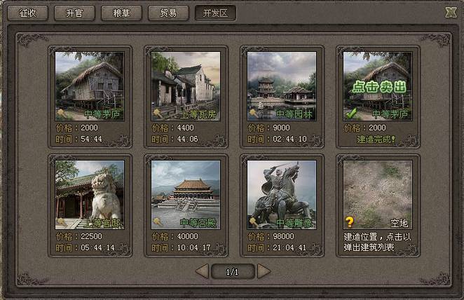 b. 6种建筑:开发区可建造建筑分为:茅庐、瓦房、园林、官邸、宫殿、雕像6类;