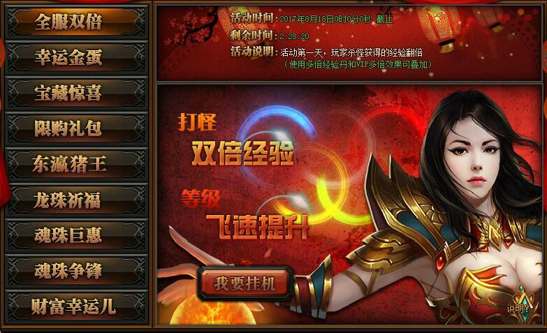 【活动详情】:活动期间玩家打怪挂机可获得双倍经验加成,此效果与VIP加成及经验卷轴不冲突,让您等级飞速提升。