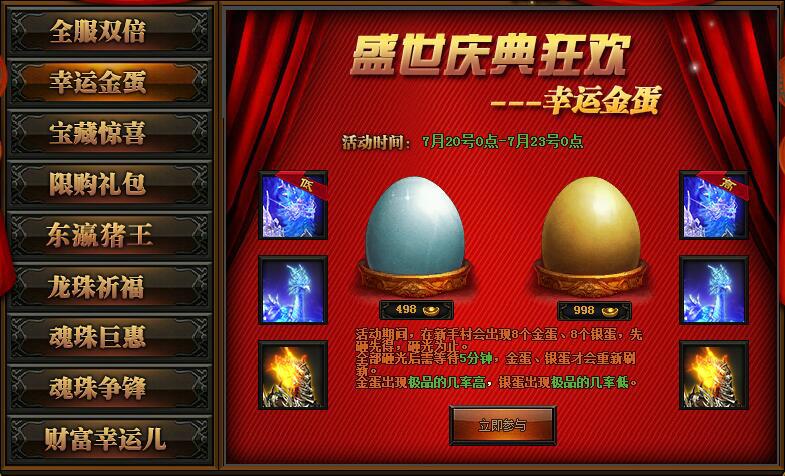 【活动详情】:活动期间新手村会出现8个金蛋和8个银蛋,手快有、手慢无,全部砸完后需等待5分钟刷新,金蛋出现极品道具的几率高,更有机会开出盛世神龙、寒冰凤凰、狱火麒麟坐骑时装。