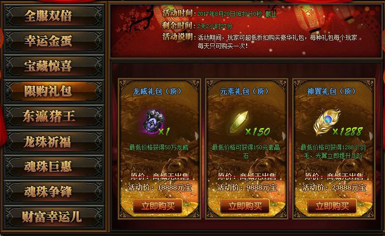 【活动详情】:活动期间推出商城无出售的超低折扣豪华礼包,玩家可直接消耗元宝进行购买,每种礼包每位玩家每天只能购买一次