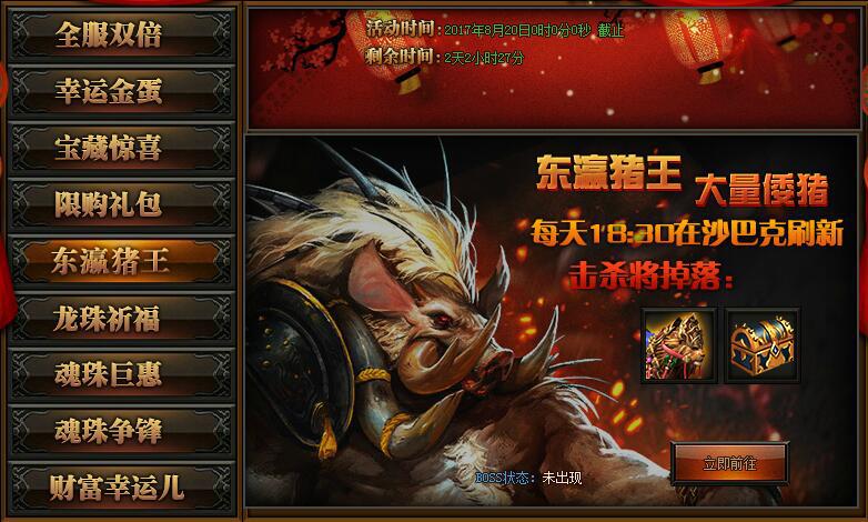 【活动详情】:活动期间每日18:30沙巴克会刷出猪王,攻击猪王可以获得海量奖励,更有神秘坐骑和神秘宝箱,小伙伴们不要错过哦