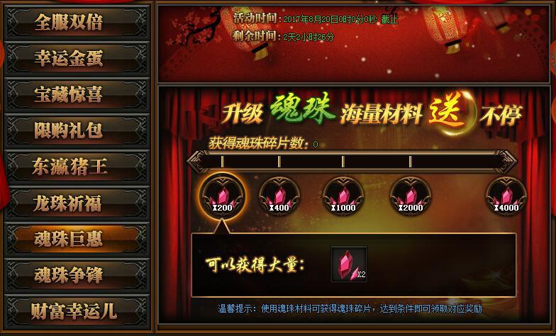 【活动详情】:活动期间升级魂珠海量材料送不停,心动不如行动。(温馨提示:使用魂珠材料可获得魂珠碎片,达到条件即可领取对应奖励)