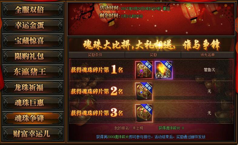 【活动详情】:活动期间魂珠大比拼,大礼相送,谁与争锋;满2000魂珠碎片即可参与排名,活动结束后,奖励通过邮件发放。
