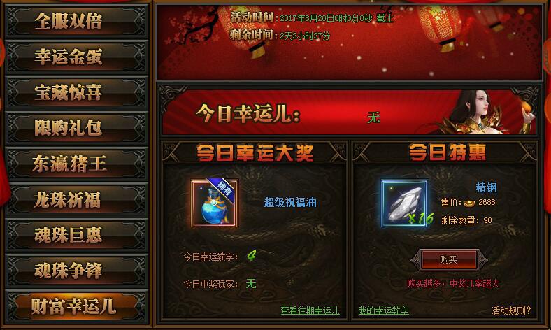 【活动详情】:活动期间,每日0:00-21:00可购买特惠礼包,每服限购100个;购买越多,中奖几率越大,每日21点将会抽出一个当日的幸运数字,中奖数字所属玩家将会获得当日的幸运大奖,奖励通过邮件发放.
