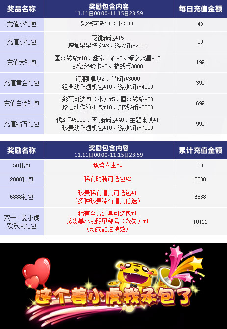 一年一度双十一又来咯,此番姜小虎将陪你一起狂欢双十一。活动期间每日充值一定金额,即有诸多好礼免费送,累计充值一定金额,更有超多珍贵大礼,同时姜小虎限量珍贵酷炫称号也将一同奉上,小伙伴们抓住机会,快快出手吧!