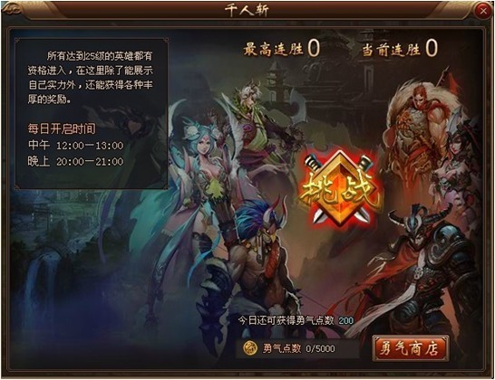 《轩辕变》每天系统固定在中午12:00—14:00,晚上19:00—21:00点开启千人斩。玩家进入战场后,可以进行实时战斗。不论胜负,都将获得勇气点数,勇气点数可到勇气商店兑换各种珍惜道具。