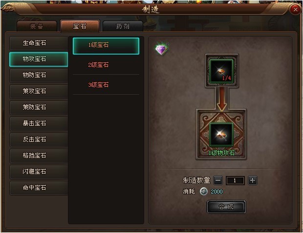 2. 先由宝石碎片合成一级宝石,之后每次由前一级的低级宝石合成后一级的高级宝石.(如一级宝石合成二级宝石,二级宝石再合成三级宝石)