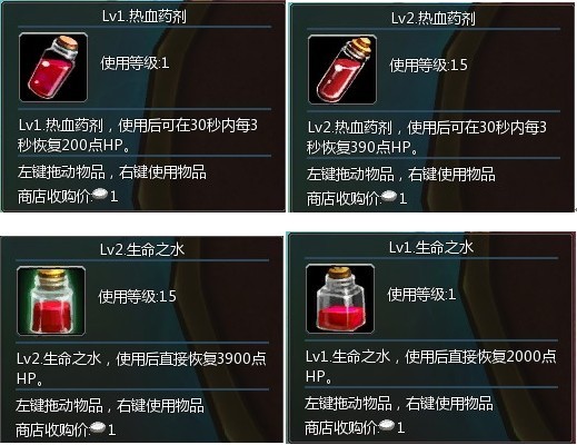 4、LV2热血药剂20个、LV1热血药剂20个、LV2生命之水20个、LV1生命之水20个