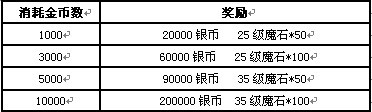 1、活动结束后,根据累计消耗金币数量发放奖励。例如:活动结束后累计消耗3000金币,则可领取60000银币 和25级魔石*100,累积消耗7000金币,则可领取90000银币 35级魔石*50。