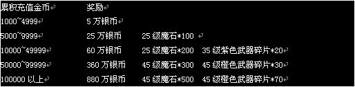 1、活动结束后,累积充值达到上述金币数量区间,方可获得奖励。奖励只能领取一次,如活动结束后累计充值7000金币,可以领取5000~9000档的奖励,但不能再领取其他金币数量区间的奖励的。