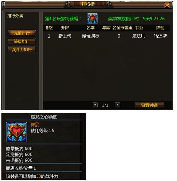在充值活动截至时间点,所有服务器充值排名第一的玩家将赢取传说中的绝世勋章——“魔龙之心勋章”。