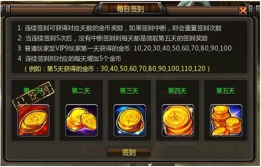 1:连续签到可获得对应天数的金币奖励,如果签到中断,则会重置签到次数。