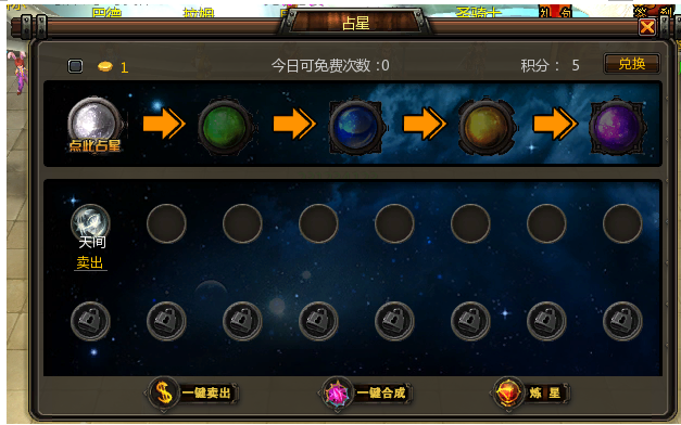 2、玩家点击占星界面中的"点击占星"即可进行占星。当玩家背包中的星运不足时,可以勾选金币进行占星,则下一次占星将消耗背包中的金币。