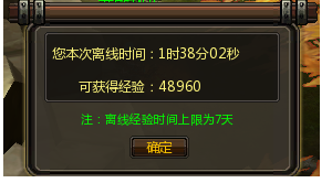 1、当玩家关闭游戏后,离线挂机系统将自动智能启动,为玩家累计离线挂机经验。离线挂机累计天数上限为7天,超过7天登陆游戏的玩家,只会收到离线7天的挂机经验奖励。