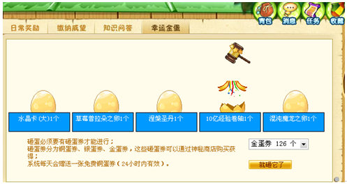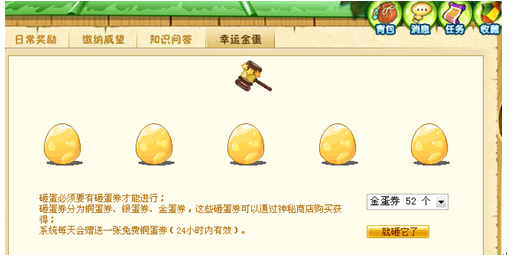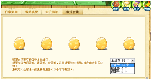 幸运金蛋分为金蛋、银蛋、铜蛋,选择后必须要有相应的砸蛋券才能进行砸蛋。金蛋卷、银蛋卷神秘商店有贩卖,铜蛋卷可通过完成【任务面板】-【活动任务】处兑换铜蛋卷任务获得。