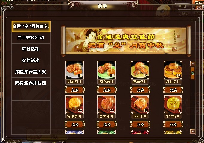 点击墨家行馆中的【精彩活动】按钮打开活动界面,选择“金秋‘兑’月换好礼”活动,即可在活动界面中用获得的中秋月饼兑换奖励。