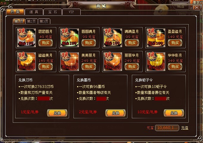 活动期间,商城中将会限量出售各种中秋月饼,同时进行探险或组队副本也有一定几率掉落,在活动界面中兑换即有很大概率获得刀币、镶嵌宝石和套装部件!