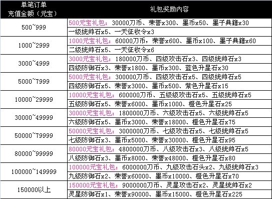 活动内容:活动时间内单笔充值达到相应额度即可获得相应的礼包一份。