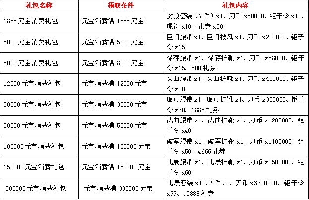 活动内容:活动时间内累计消费达到指定额度即可获得相应的钜子套装礼包。