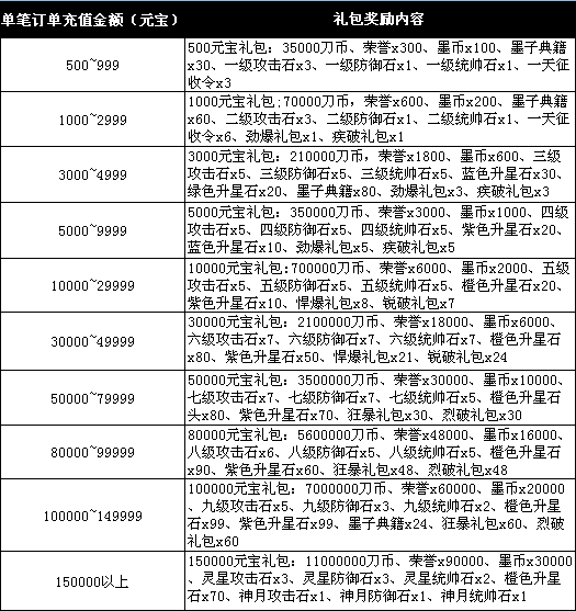 活动内容:活动时间内单笔充值达到相应额度即可获得相应的礼包一份。