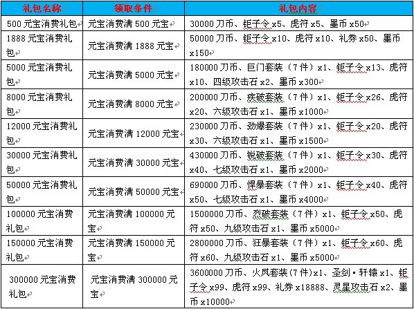 活动内容:活动期间,玩家消费元宝达到相应额度即可领取神兵套装等奖励!