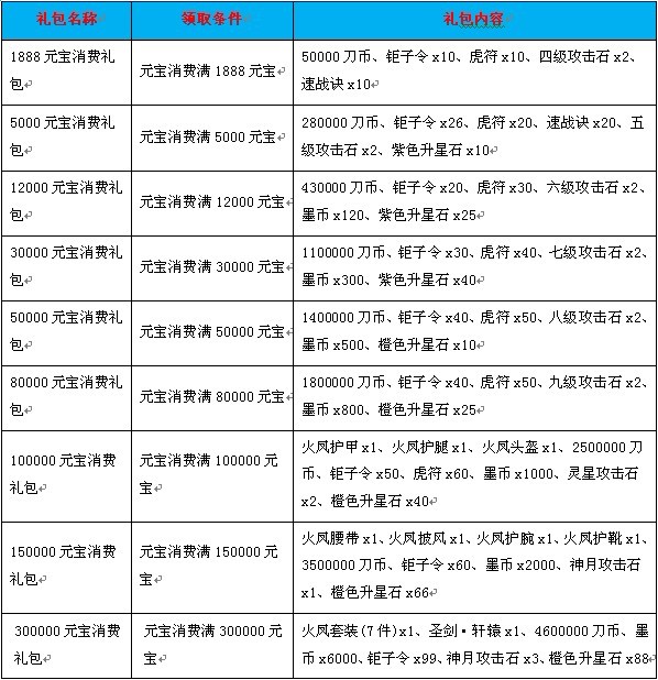 活动内容:活动期间,玩家消费元宝达到指定额度即可领取相应的礼包奖励!