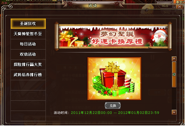 点击墨家行馆中的【精彩活动】按钮打开活动界面,选择“圣诞狂欢”活动,即可在活动界面中用获得的圣诞卡兑换。