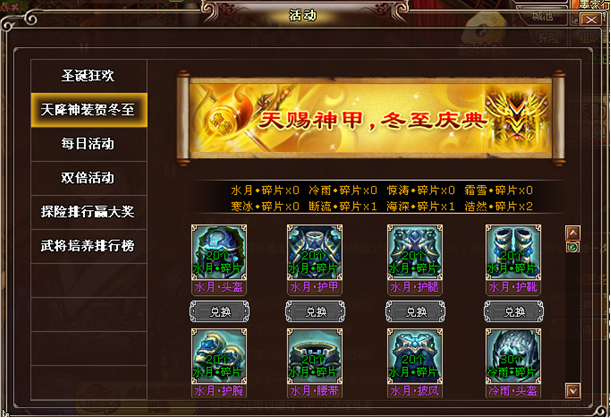 集碎片,换套装!套装碎片一共有8种,不同的碎片可以兑换不同等级的冬至套装。
