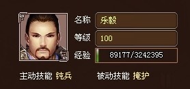 战斗特性:乐毅的主动技能钝兵可以使攻击目标和后面两个部队造成的伤害下降,被动技能掩护队友受到伤害的时候自己会分摊部分伤害。