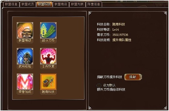 大家加入联盟后,民房会生产额外的刀币捐献给联盟科技,也可主动捐献刀币提升联盟的各种科技。可以在联盟科技处设置默认捐献的联盟科技。玩家主动捐献刀币可以获得钜子令,联盟副本和阵营副本都是需要消耗钜子令的,联盟副本是好装备的重要来源,并且通过联盟副本获得的徽章在联盟商店中兑换各种装备。