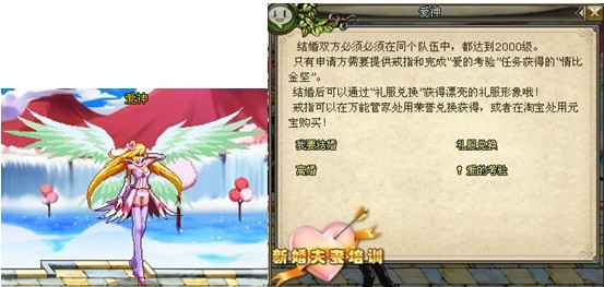 2.玩家完成任务,持有结婚戒指并点击使用后可以申请结婚,求婚戒指/求婚钻戒可以通过荣誉兑换和VIP商城购买两种渠道获得。(结婚双方必须必须在同个队伍中,双方必须都处于未婚、异性状态。并且已经完成“爱的考验”任务,如果被申请方选择同意,就求婚成功啦!)