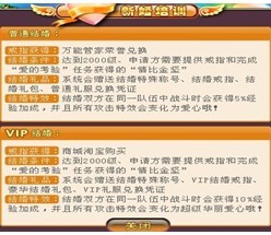 VIP结婚:VIP戒指5200元宝一对(只能使用元宝购买)。礼服持续时间10天