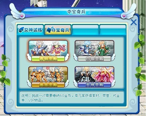 2、挑战一次青铜进 入需要缴纳60金币,击杀怪 物以后才会扣除金币。每天最多挑战5次,有几率获得素材、荣誉、代金券、vi~p物品。