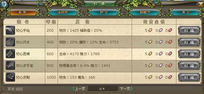 2:装备打造说明.需要一定数量的相应材料来合成不同质量的装备。列如:军官初心的装备刁蛮手枪需要6个刁蛮泡泡棉,5个刁蛮丝袜,1个女神面具,2个刁蛮神女粮票。当材料和打造费用都齐的时候,点击打造后装备将出现在背包里。