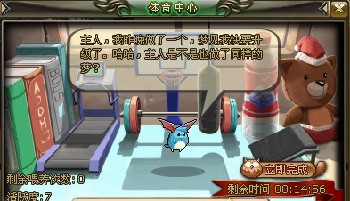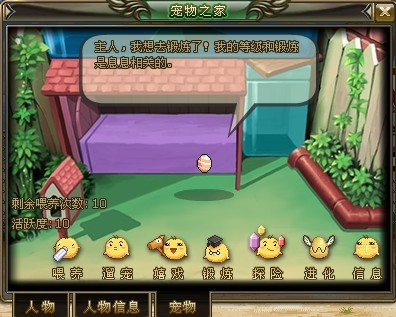 3:宠物操作.选择喂养可以提高宠物经验值或亲密度;嬉戏可以提高宠物的亲密度;锻炼可以提高宠物经验值;探险可以有一定几率获得宝物。嬉戏,锻炼,探险等方式各有一定的时间限制。消费元宝可以立即完成。