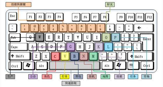 快捷键列表: 角色→ C 背包→ B 技能→ K 好友→ O 公会→ G 任务→ L 挂机→ N 市场→ P 地图→ M 生产→ W 打坐→ V 快速拾取→ 空格SPACE 技能快捷键→1-9