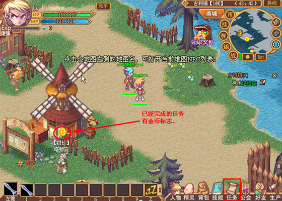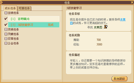 第一次技能学习 当你的角色到达5级时,你会自动接到一个技能学习的任务,终于可以学习技能了。技能的学习将会提高你的战斗实力,点击任务说明中的蓝色任务目标提示,进入自动寻找目标状态或点击地图上的任务NPC来完成任务。