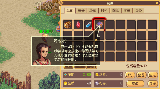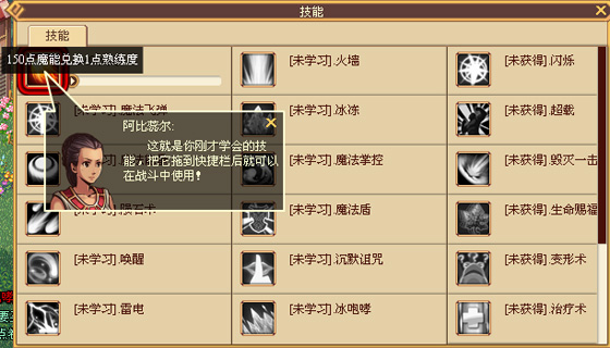 完成NPC给予的任务之后,会获得一本技能书,双击技能书学习技能。技能学习之后,可以从技能面板中拖到快捷栏中方面使用。另外玩家可以通过使用魔能或使用技能打怪来提升技能熟练度。