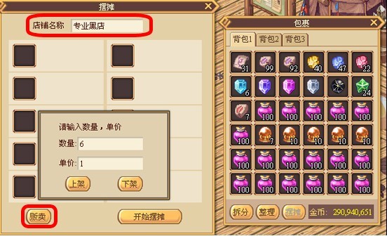第二步:在摆摊窗口的上方输出店铺的名称。点击下方贩卖按钮然后点击背包里准备出售的物品,或直接将背包物品拖拽至摆摊窗口中的物品栏后,弹出物品出售价格及数量设置窗口。完成物品出售价格及数量设置后,点击上架按钮将完成物品上架。点击下架按钮将取消物品出售设置。已绑定的物品不可以进行摆摊出售。