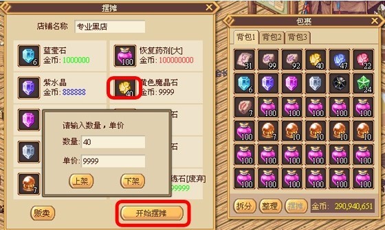 第三步:物品上架后如果需要对已上架物品进行出售信息修改,点击摆摊窗口物品栏中的待出售物品将弹出物品价格及数量设置窗口,玩家可以修改物品出售设置或将物品下架取消出售设置。待出售物品最低出售价格为1,最高出售价格为100000000。当物品价格为1-9999时为综合数字显示,10000-999999时为蓝色数字显示,1000000-99999999时为绿色数字显示,100000000为最大价格数字显示为红色。点击摆摊按钮开始摆摊。