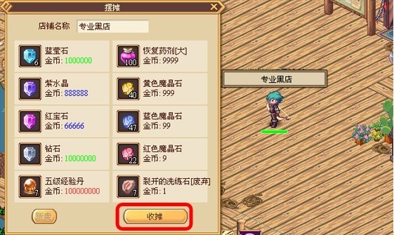 第四步:摆摊时,玩家角色头顶出现店铺名称,摆摊时玩家不可移动,摆摊窗口不能关闭。当玩家不需要摆摊时,可以通过摆摊窗口中的收摊按钮结束摆摊状态。结束摆摊时所有上架物品出售设置取消。当玩家下线或死亡时自动取消摆摊状态。