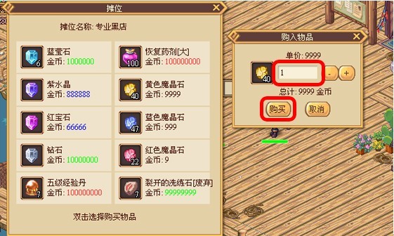 在购买窗口中,双击需要购买的物品,会弹出购买信息窗口。通过购买信息窗口输出需要购买的物品数量或点击“+”“-”来选择购买数量。确定购买数量后点击购买,扣除购买费用并获得相应数量的物品,完成交易。