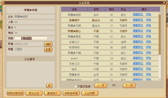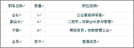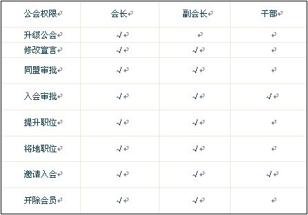 公会管理 公会成员设有会长、副会长、干部、普通成员共4个等级,不同等级成员权限不同。公会可升级,共10级,使用公会资金与公会贡献度来提升等级。1级公会可容纳20人,每升1级加5人,至多65人。公会本身有专属的公会任务,会员完成以后公会获得公会资金与公会贡献度。会员完成公会任务后可领取一定的魔能、贡献度为奖励。