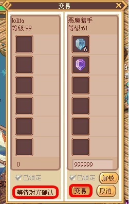 当被请求交易目标同意进行交易后,双方弹出交易窗口。每次交易有六个物品交易位置,已叠加物品只占一个交易位置;一个游戏币交易栏。