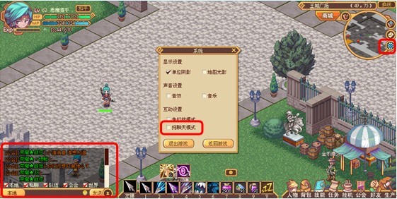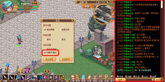 玩家可以通过游戏界面右上角的系统设置功能设置游戏中的聊天方式,普通聊天模式不会占用太多游戏画面,只在游戏的左下角以透明背景出现,玩家可以看到更多游戏画面。纯聊天模式则会占用较多游戏画面,来方便喜欢聊天的玩家,满足玩家聊天需求。