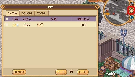 游戏中的邮件功能可以帮助玩家远距离或非同时在线时完成信息沟通、物品赠与或部分交易行为。在游戏界面左上方的辅助功能区域点击信封标志的图标,可以为您打开游戏里的邮件系统窗口。玩家可以在这里查看邮件信息、系统信息以及发送邮件功能或删除邮件。