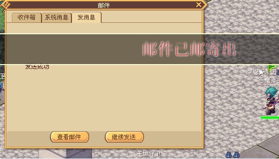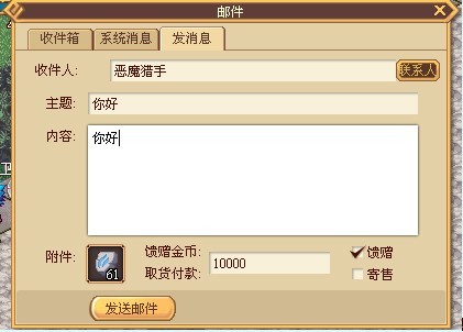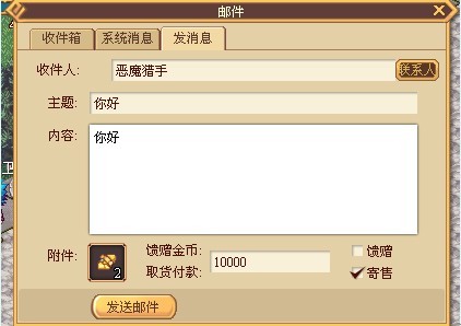 选择邮件窗口中的发送消息,进入邮件发送界面,填写收件人名称和邮件文本后就可以发送邮件了,如果需要赠送对方物品或游戏币,可以将背包的中物品拖拽到在附件栏,在游戏币填写框中输出金币数量后勾选馈赠选项即可。